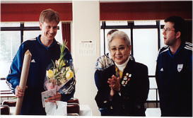 | 誕生日おめでとう 期間中に誕生日を迎えた選手は、掲示板に 張り出され、分村長からお祝いの花束や 記念品を贈られた。。 普段は入室できない選手食堂でのセレモニーに アシスタントたちは「ハッピーバースデー」の コーラス隊及び拍手隊として参加した。 写真はイギリスの選手と分村長(女性)。 あるとき掲示板にスイスの団長の結婚記念日が 書いてあった。選手たちが書いたのだ。 熾烈な戦いと思っていたオリンピックが、こんなに 和やかなのに驚いた。 |